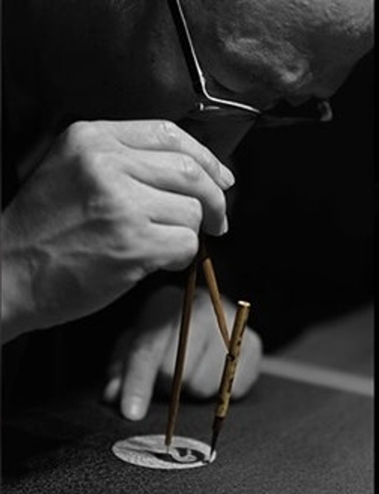 Monsho-uwae refers to the technique of hand-painting Kamon on kimono, and Monsho-uwaeshi is an artisan who performs it. Drawing Kamon takes seemingly simple tools – a ruler and bamboo compass with a superfine brush attached to it.